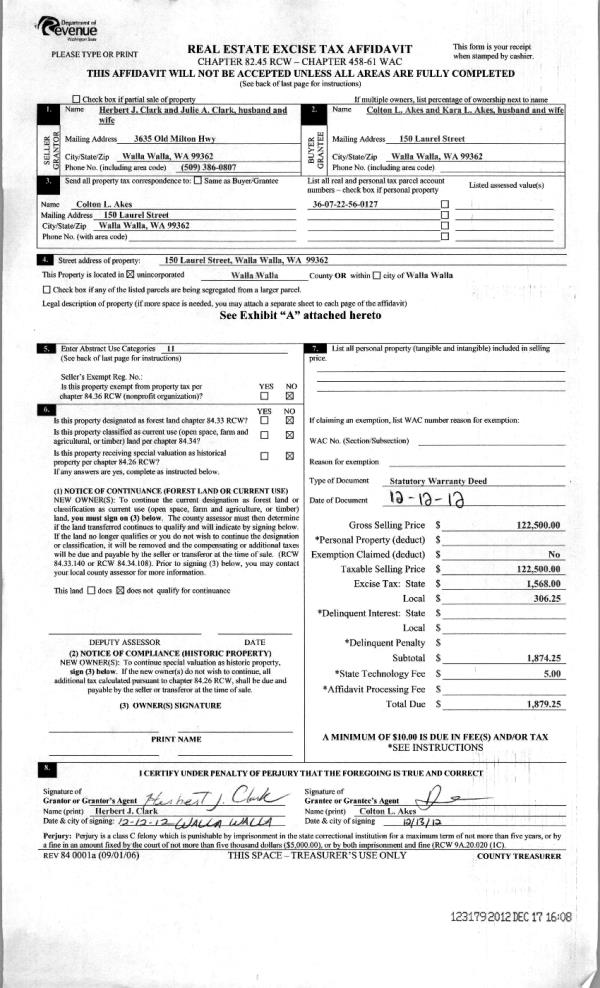 | 2 | 12/17/2012 | WARRANTY D | WARRANTY DEED | CLARK, HERBERT J & JULIE A | AKES, COLTON L & KARA L | | | $122,500.00 | 123179 | 2012-11255 |