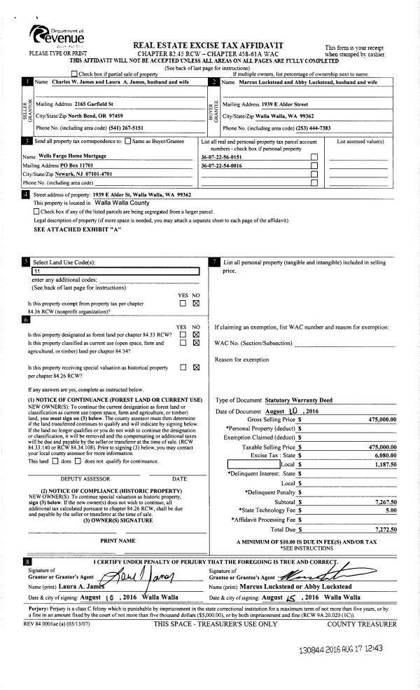 | 1 | 08/17/2016 | SWD | STATUTORY WARRANTY DEED | JAMES CHARLES W & LAURA A | LUCKSTEAD MARCUS & ABBY | | 2-PARCELS | $475,000.00 | 130844 | 2016-06564 |