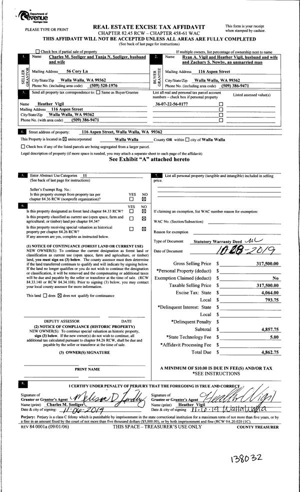| 3 | 11/06/2019 | SWD | STATUTORY WARRANTY DEED | SEELIGER CHARLES M & TANJA N | VIGIL RYAN A & HEATHER | | | $317,500.00 | 138032 | 2019-09106 |