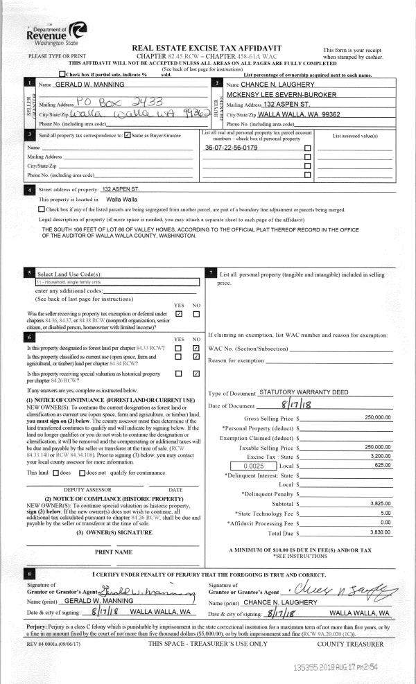 | 2 | 08/17/2018 | SWD | STATUTORY WARRANTY DEED | MANNING GERALD W | LAUGHERY CHANCE N | | | $250,000.00 | 135355 | 2018-06777 |