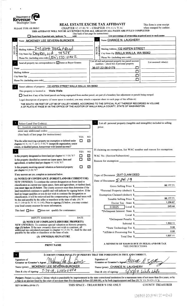 | 1 | 05/30/2019 | QCD | QUIT CLAIM DEED | SEVERN-BUROKER MCKENSY LEE | LAUGHERY CHANCE N | | | $98,178.00 | 136969 | 2019-03671 |