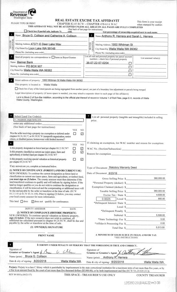 | 1 | 08/22/2018 | SWD | STATUTORY WARRANTY DEED | COLLISON BRUCE G & CATHERINE | HERRERA ANTHONY R & SARAH L | | | $360,000.00 | 135393 | 2018-06937 |