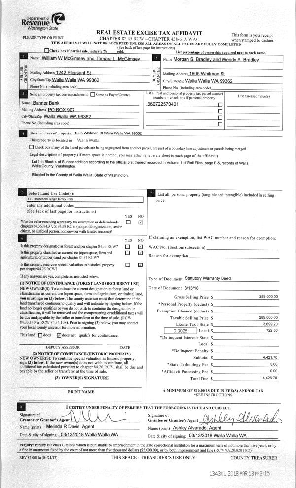 | 2 | 03/13/2018 | SWD | STATUTORY WARRANTY DEED | MC GIMSEY WILLIAM W & TAMARA | BRADLEY MORGAN S & WENDY A | | | $289,000.00 | 134301 | 2018-01976 |