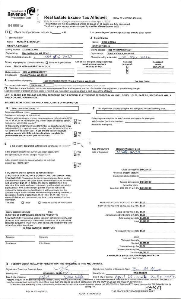 | 1 | 04/29/2022 | SWD | STATUTORY WARRANTY DEED | BRADLEY MORGAN S & WENDY A | MEZA ERIC M & BRITTANY COLIS | | | $450,000.00 | 143867 | 2022-03693 |