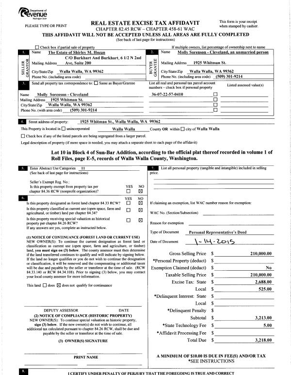 | 2 | 01/14/2015 | DPR | DEED OF PERSONAL REPRESENTATIVE | HOZAN SHIRLEY M ESTATE OF | SORENSON-CLEVELAND MOLLY | | | $210,000.00 | 127328 | 2015-00682 |