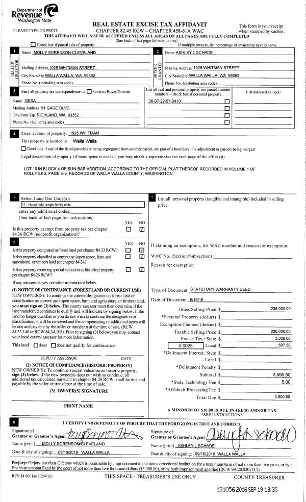 | 1 | 09/19/2016 | SWD | STATUTORY WARRANTY DEED | SORENSON-CLEVELAND MOLLY | SCHADE ASHLEY L | | | $235,000.00 | 131056 | 2016-07617 |