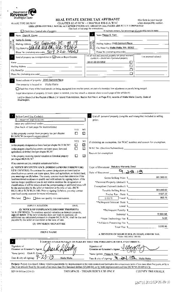 | 3 | 09/26/2013 | WARRANTY D | WARRANTY DEED | COVEY, CLARK R & KATHY S | YAM, PEGGY S | | | $361,500.00 | 124718 | 2013-09792 |