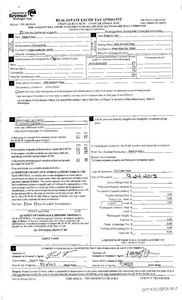 | 2 | 09/26/2013 | QCD | QUIT CLAIM DEED | YAM, DAVID A | YAM, PEGGY S | | | $0.00 | 124719 | 2013-09793 |