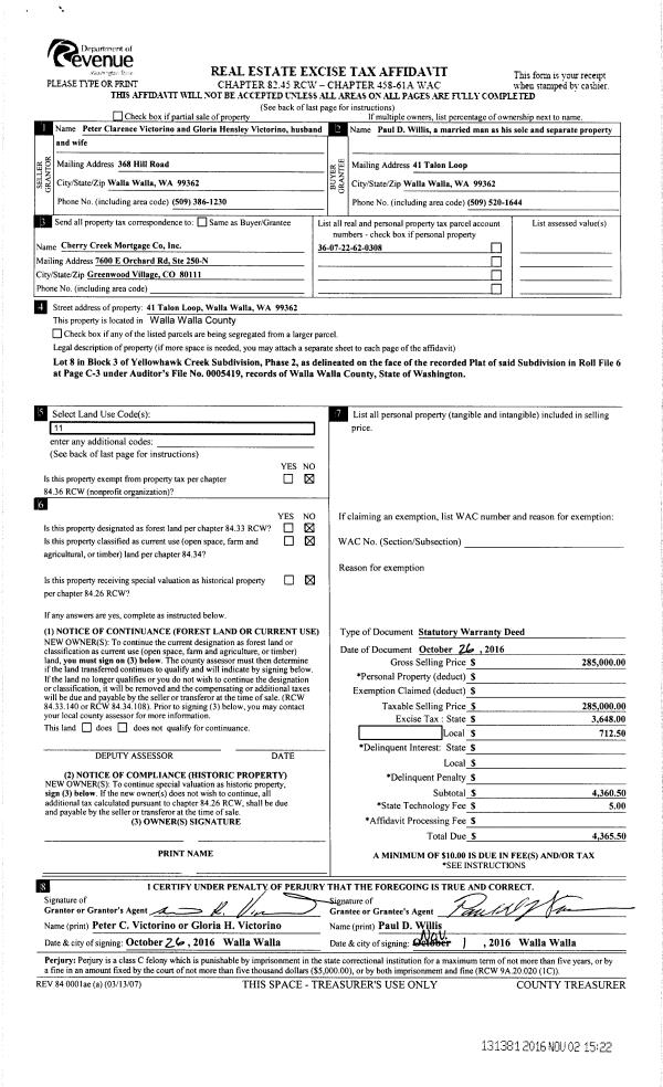 | 2 | 11/02/2016 | SWD | STATUTORY WARRANTY DEED | VICTORINO PETER C & GLORIA | WILLIS PAUL D | | | $285,000.00 | 131381 | 2016-09112 |