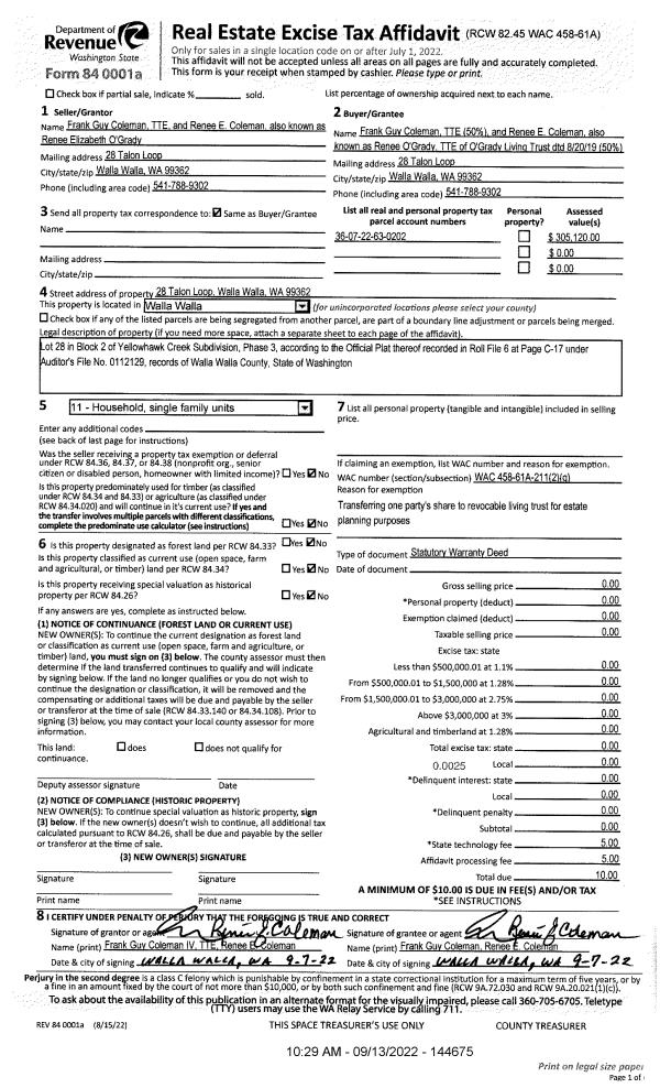 | 1 | 09/13/2022 | SWD | STATUTORY WARRANTY DEED | FRANK G COLEMAN IV LIVING TRUST | FRANK G COLEMAN IV LIVING TRUST | | | $0.00 | 144675 | 2022-07621 |