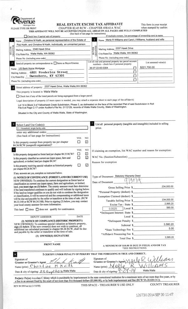 | 2 | 09/30/2014 | SWD | STATUTORY WARRANTY DEED | KEITH PAUL B ESTATE OF | WILLIAMS MERLE R & CAROL J | | | $234,000.00 | 126730 | 2014-07147 |