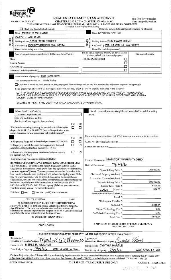 | 1 | 07/15/2016 | SWD | STATUTORY WARRANTY DEED | WILLIAMS MERLE R & CAROL J | HARTLE CYNTHIA | | | $265,900.00 | 130625 | 2016-05512 |