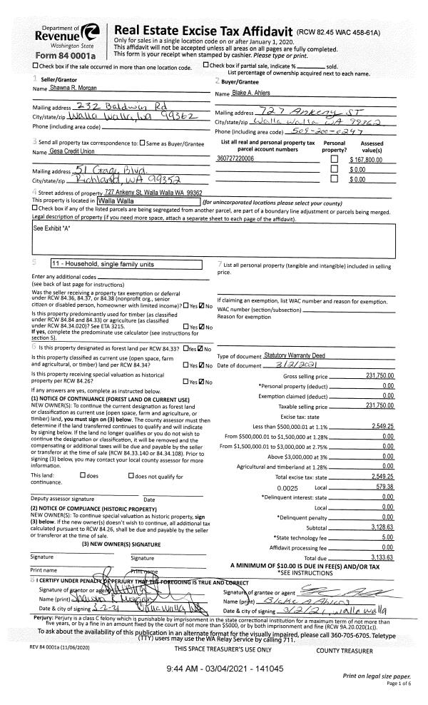 | 2 | 03/04/2021 | SWD | STATUTORY WARRANTY DEED | MORGAN SHAWNA R | AHLERS BLAKE A | | | $231,750.00 | 141045 | 2021-02491 |
