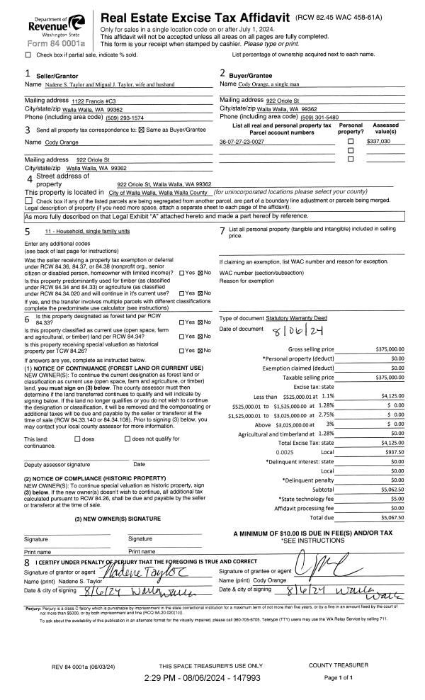 | 1 | 08/06/2024 | SWD | STATUTORY WARRANTY DEED | TAYLOR NADENE S & MIGUAL J | ORANGE CODY | | | $375,000.00 | 147993 | 2024-04327 |