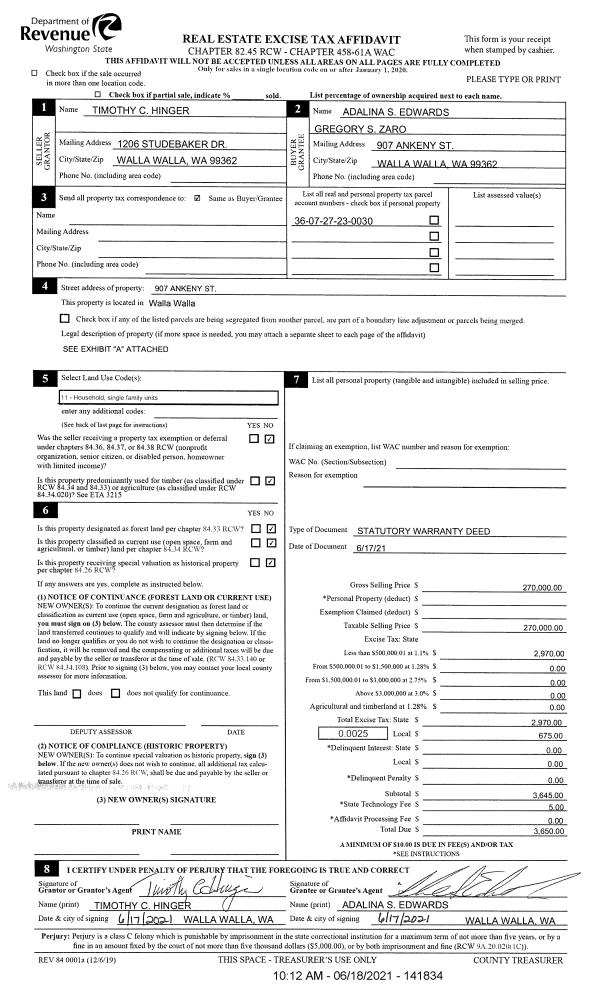 | 1 | 06/18/2021 | SWD | STATUTORY WARRANTY DEED | HINGER TIMOTHY C | EDWARDS ADALINA S | | | $270,000.00 | 141834 | 2021-07435 |