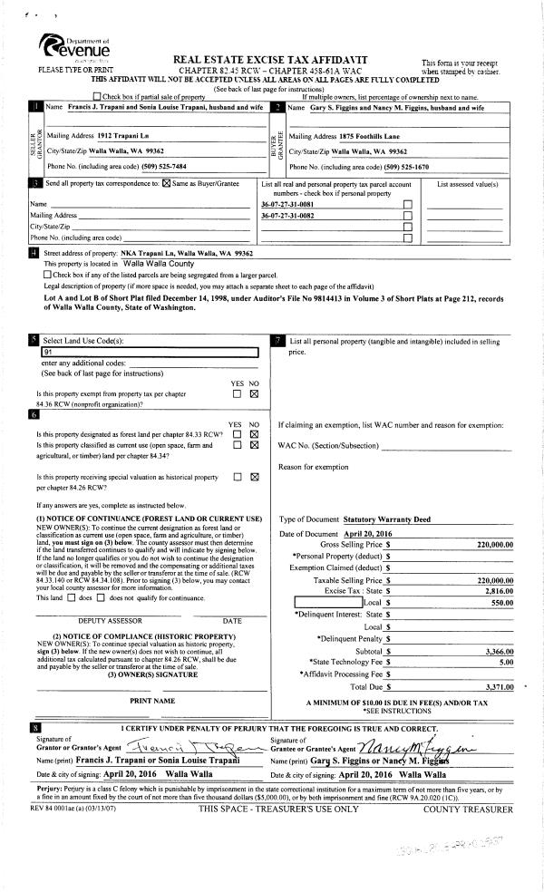| 1 | 04/20/2016 | SWD | STATUTORY WARRANTY DEED | TRAPANI FRANCIS JOHN & SONIA L | FIGGINS GARY & NANCY | | 2-PARCELS | $220,000.00 | 130061 | 2016-02895 |