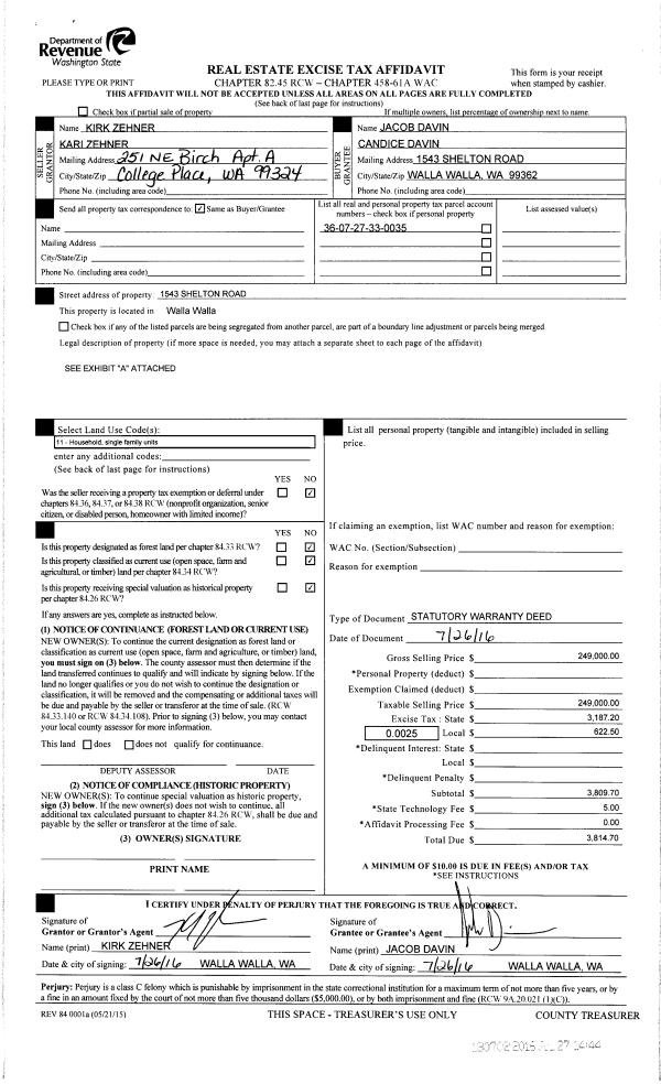 | 2 | 07/27/2016 | SWD | STATUTORY WARRANTY DEED | ZEHNER KIRK & KARI | DAVIN JACOB & CANDICE | | | $249,000.00 | 130702 | 2016-05885 |