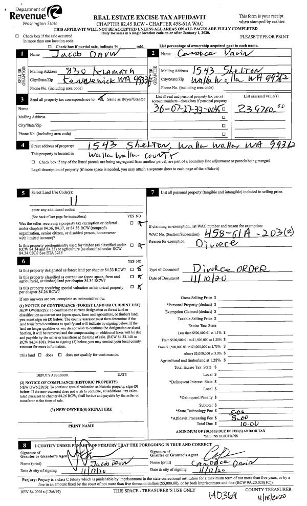 | 1 | 11/18/2020 | QCD | QUIT CLAIM DEED | DAVIN JACOB & CANDICE | DAVIN CANDICE | | | | 140369 | 2020-12190 |