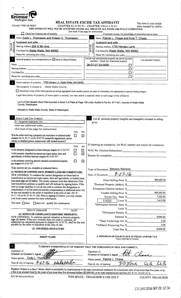 | 1 | 09/28/2016 | SWD | STATUTORY WARRANTY DEED | THOMASON CODY L | CHASE PARTICK L & KYLA T | | | $565,000.00 | 131140 | 2016-07965 |