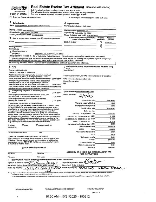 | 1 | 10/21/2025 | SWD | STATUTORY WARRANTY DEED | SCHOOL HOUSE LLC | SARDINA EMILIO | | | $330,000.00 | 150212 | 2025-06473 |