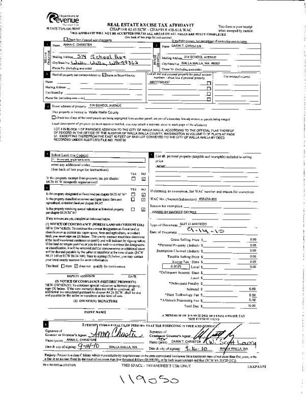 | 5 | 09/17/2010 | WARRANTY D | WARRANTY DEED | CHRISTEN, ANNA C | CHRISTEN, DARIN T | | | | 0 | CC #09-3-00145-1 |