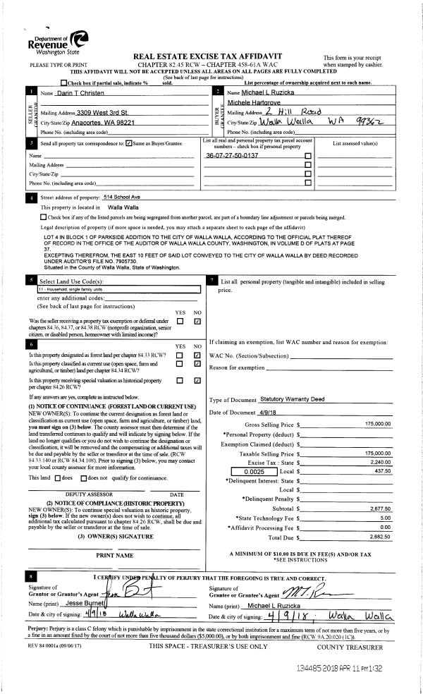 | 3 | 04/11/2018 | SWD | STATUTORY WARRANTY DEED | CHRISTEN DARIN T | RUZICKA MICHAEL L | | | $175,000.00 | 134485 | 2018-02807 |
