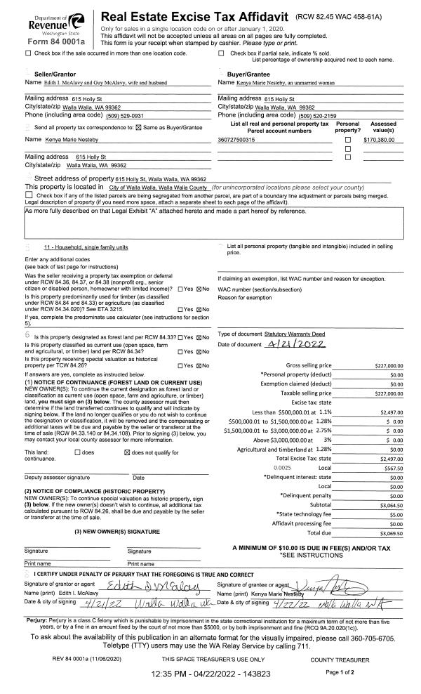 | 1 | 04/22/2022 | SWD | STATUTORY WARRANTY DEED | MC ALAVY EDITH I | NESTEBY KENYA MARIE | | | $227,000.00 | 143823 | 2022-03465 |