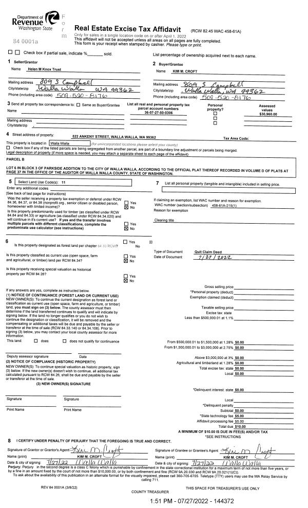 | 4 | 02/07/2022 | QCD | QUIT CLAIM DEED | KNOX DEAN W LIVING TRUST | CROFT KIM M | 2 PARCEL | | $0.00 | 143364 | 2022-01199 |