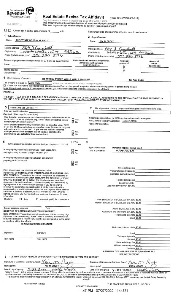 | 3 | 07/27/2022 | DPR | DEED OF PERSONAL REPRESENTATIVE | KNOX DEAN W ESTATE OF | CROFT KIM M | | | $0.00 | 144371 | 2022-06290 |