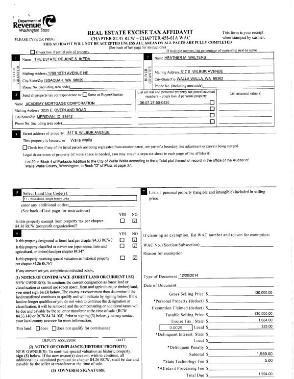 | 2 | 12/19/2014 | SWD | STATUTORY WARRANTY DEED | IKEDA JUNE S ESTATE OF | WALTERS HEATHER M | | | $0.00 | 127169 | 2014-09340 |