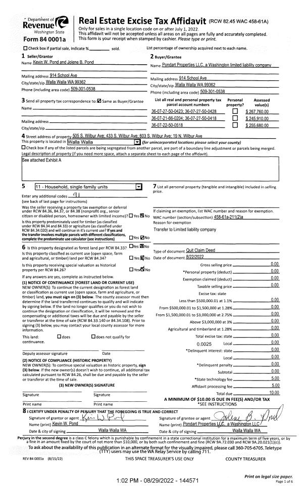 | 2 | 08/29/2022 | QCD | QUIT CLAIM DEED | POND KEVIN W & JOLENE B | PONDART PROPERTIES LLC | | | | 144571 | 2022-07198 |