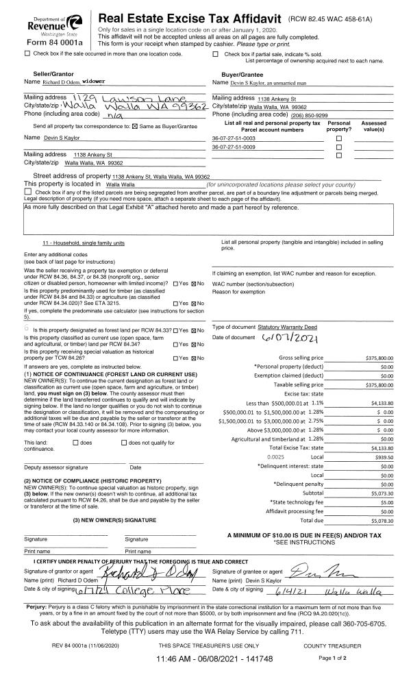 | 1 | 06/08/2021 | SWD | STATUTORY WARRANTY DEED | ODEM RICHARD D & MARY J | KAYLOR DEVIN S | | 2-PARCELS | $375,800.00 | 141748 | 2021-06946 |