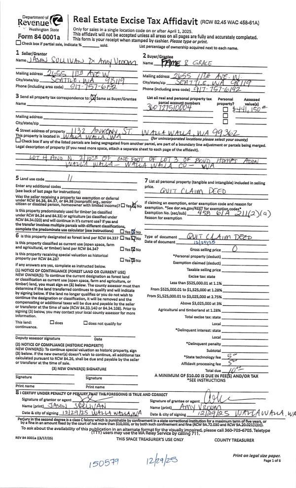 | 1 | 12/29/2025 | QCD | QUIT CLAIM DEED | SULLIVAN JASON & AMY VROOM | FAME & GRACE LLC | | | | 150579 | 2025-07964 |