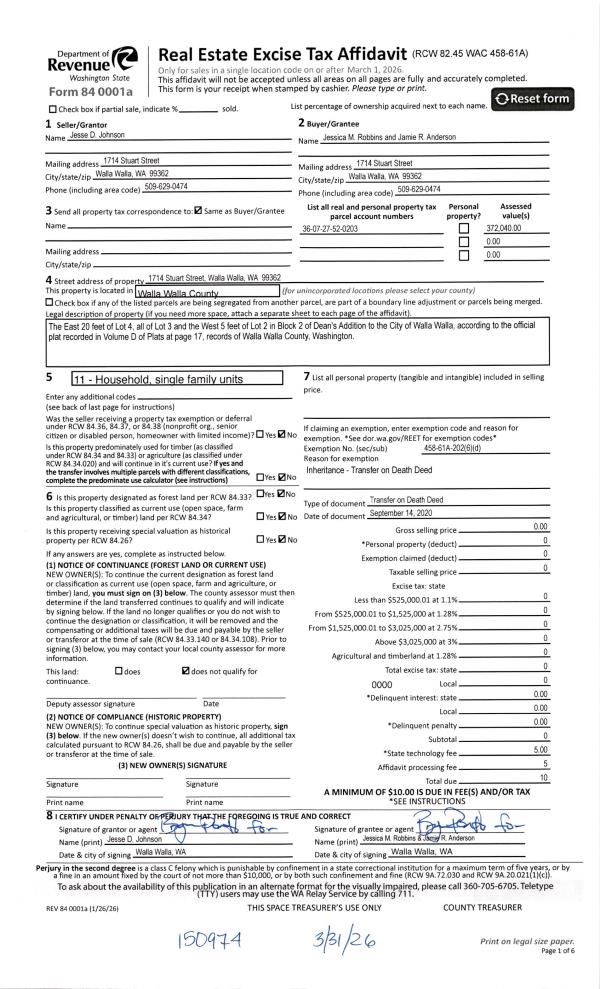 | 1 | 03/31/2026 | DEATH CERT | DEATH CERTIFICATE | JOHNSON JESSE DUANE | ROBBINS M JESSICA & JAMIE R ANDERSON | | | | 150974 | 2026-02003 |