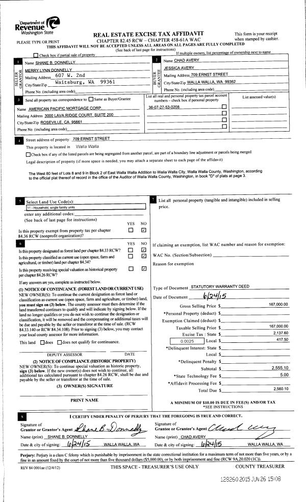 | 2 | 06/26/2015 | SWD | STATUTORY WARRANTY DEED | DONNELLY SHANE B | AVERY CHAD & JESSICA | | | $167,000.00 | 128260 | 2015-05454 |