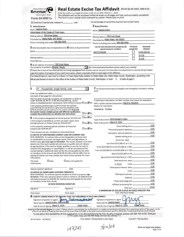 | 1 | 03/12/2024 | ADMD | ADMINISTRATOR'S DEED | AVERY CHAD & JESSICA | AVERY JESSICA | | | | 147241 | 2024-01210 |