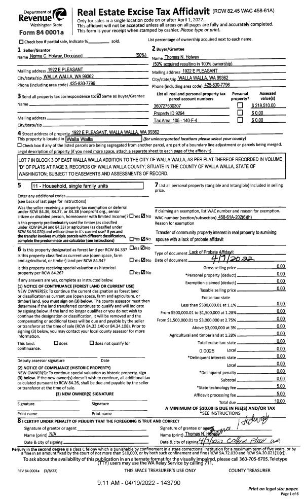 | 3 | 04/07/2022 | LOPA | LACK OF PROBATE AFFIDAVIT | HOLWAY NORMA C ESTATE | HOLWAY THOMAS N | | | $0.00 | 143790 | 2022-03305 |