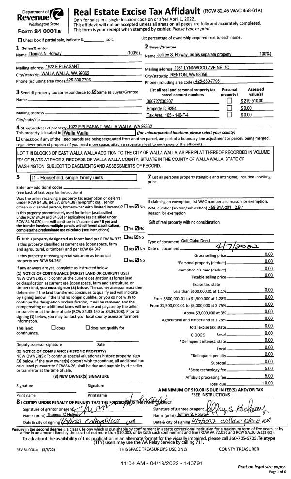 | 2 | 04/07/2022 | QCD | QUIT CLAIM DEED | HOLWAY THOMAS N | HOLWAY JEFFREY S | | | $0.00 | 143791 | 2022-03313 |