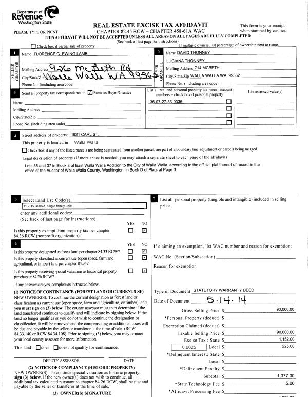 | 2 | 05/16/2014 | SWD | STATUTORY WARRANTY DEED | EWING FLORENCE | THONNEY DAVID & LUCIANA | | | $90,000.00 | 125898 | 2014-03332 |