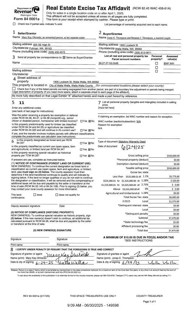 | 1 | 06/30/2025 | SWD | STATUTORY WARRANTY DEED | GHIRARDO MARY KAY | THOMPSON JONAS E & BREANNE J | | | $550,000.00 | 149598 | 2025-03681 |