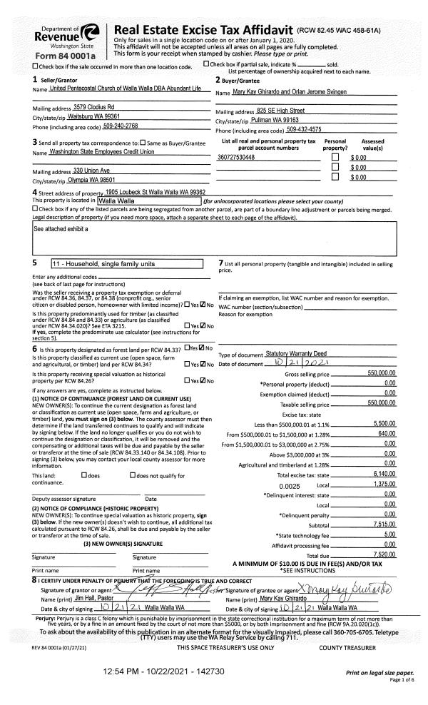 | 3 | 10/22/2021 | SWD | STATUTORY WARRANTY DEED | UNITED PENTECOSTAL CHURCH | GHIRARDO MARY KAY | | | $550,000.00 | 142730 | 2021-12806 |