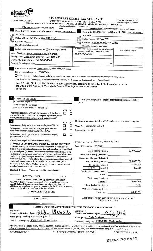 | 2 | 10/11/2017 | SWD | STATUTORY WARRANTY DEED | KOHLER LARRY G & MAUREEN M | PILKINTON DAVID R & STACEY L | | | $329,000.00 | 133384 | 2017-08083 |