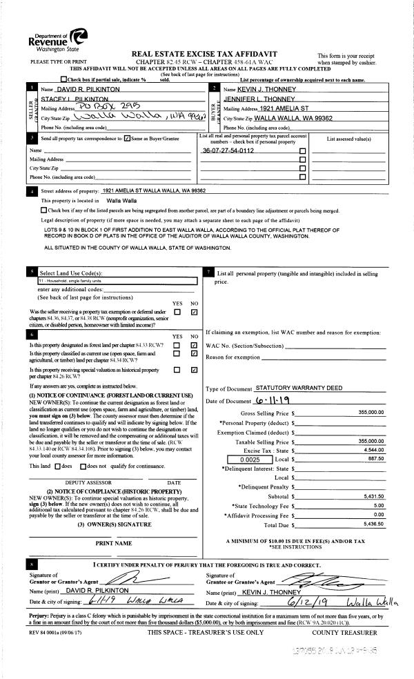 | 1 | 06/12/2019 | SWD | STATUTORY WARRANTY DEED | PILKINTON DAVID R & STACEY L | THONNEY KEVIN J & JENNIFER L | | | $355,000.00 | 137055 | 2019-04055 |