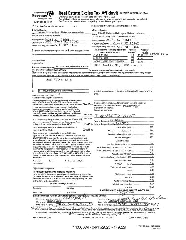 | 1 | 04/15/2025 | QCD | QUIT CLAIM DEED | MARKER ROBERT A & BETH I | MARKER FAMILY TRUST | | | | 149229 | 2025-01980 |