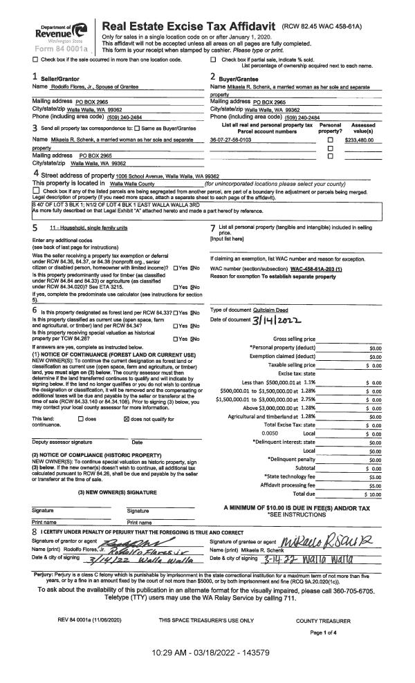 | 1 | 03/18/2022 | QCD | QUIT CLAIM DEED | FLORES RODOLFO JR | SCHENK MIKAELA R | | | | 143579 | 2022-02285 |