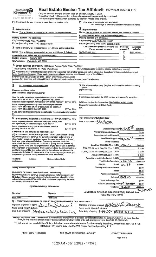 | 2 | 03/18/2022 | QCD | QUIT CLAIM DEED | SCHENK TINA M | SCHENK TINA M | | | $40,548.00 | 143578 | 2022-02284 |