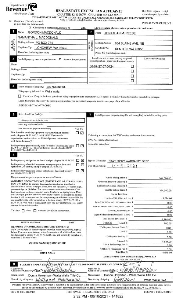 | 2 | 06/16/2021 | SWD | STATUTORY WARRANTY DEED | MACDONALD GORDON & SAMANTHA L | REESE JONATHAN M | | | $344,000.00 | 141822 | 2021-07364 |