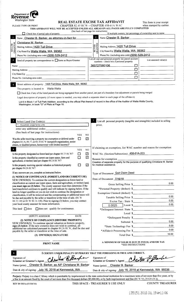 | 2 | 07/16/2018 | QCD | QUIT CLAIM DEED | BARKER CHRISTIANE M | BARKER CHESTER B ESTATE OF | | | $0.00 | 135151 | 2018-05849 |