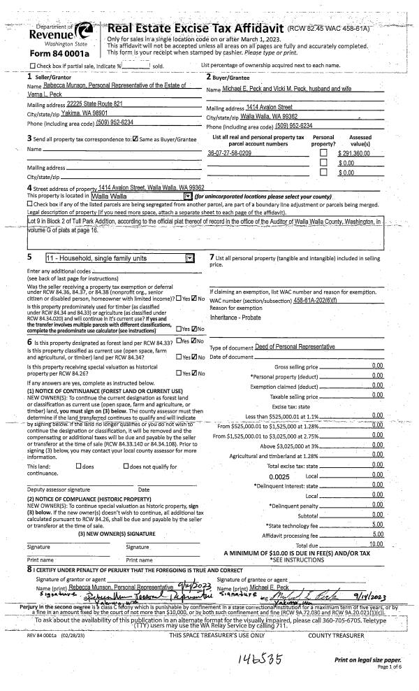 | 1 | 09/27/2023 | DPR | DEED OF PERSONAL REPRESENTATIVE | PECK VERNA L | PECK MICHAEL E & VICKI M | | | | 146535 | 2023-05656 |