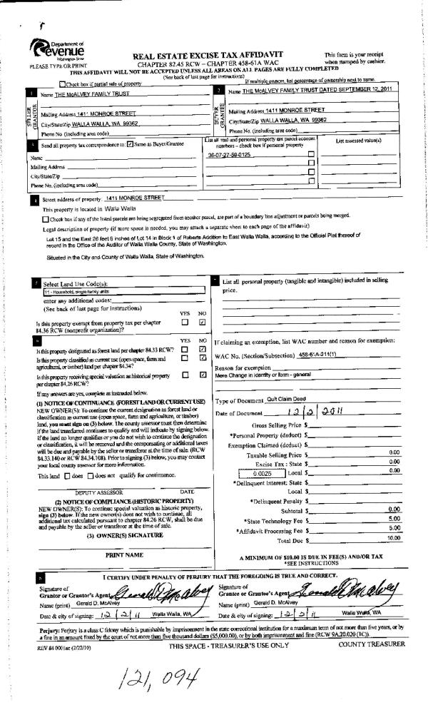 | 2 | 12/07/2011 | QCD | QUIT CLAIM DEED | MC ALVEY FAMILY TRUST | MC ALVEY FAMILY TRUST | | | | 121094 | 2011-09629 |